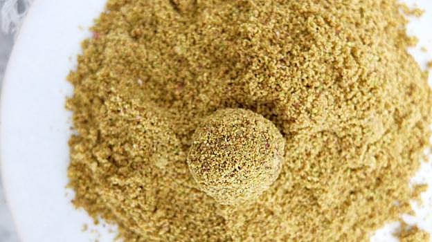 Tomamos trozos de esta pasta con las manos ligeramente humedecidas y les damos forma de bola ( o la forma que más nos guste ) y rebozamos en los pistachos pelados previamente y pulverizados ¿Hay algo más fácil?