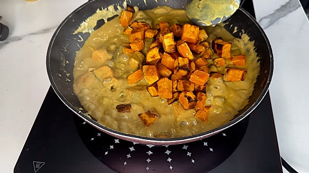 Mezclaremos y dejaremos que se vaya cocinando durante unos minutos. Una vez haya reducido, añadimos el boniato que hemos cocinado al horno en dados pequeños. Mezclamos y pasamos a nuestro plato.