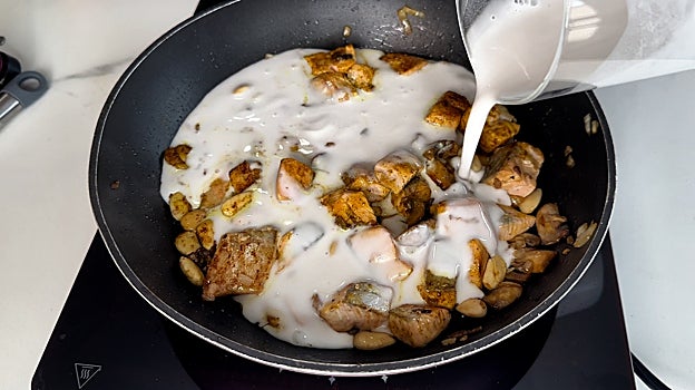 Comenzaremos añadiendo la cebolla picada. La salteamos y añadimos los champiñones laminados y seguidamente el salmón en dados. Vamos cocinando mientras añadimos las almendras, salsa de soja, cucharada de curry y la leche de coco.