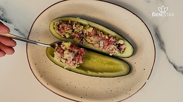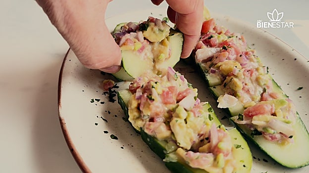 Añadimos a toda la mezcla un buen chorro de limón o de lima, una cucharadita de mayonesa y mezclamos bien. Ajustamos de sal y pimienta y rellenamos nuestros pepinos.