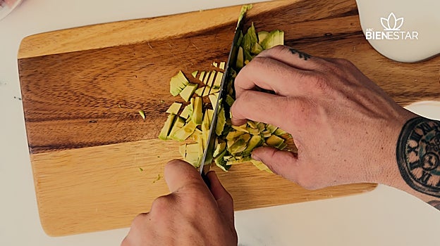 Para el pico de gallo, vamos a picar bien cebolla morada, tomate pelado y lo añadimos al bowl. Hacemos lo mismo con el aguacate, que queden trozos pequeñitos pero sin triturarlo.