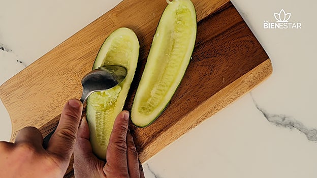 Lo primero que haremos será cortar un pepino por la mitad y vaciaremos el centro hasta verlo sin pepitas.