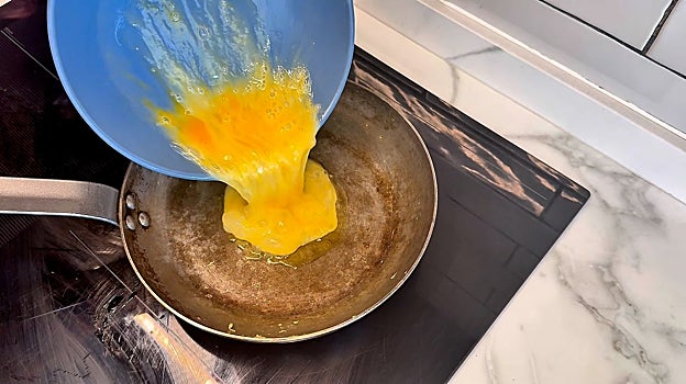 Batimos dos huevos y los añadimos a una sartén ya precalentada con un chorrito de aceite de oliva virgen extra. Cuando tengamos un líquido uniforme lo llevamos a la sartén y cocinamos sin dejar de remover para que no se quede cocinado como si fuera una tortilla y quede ligeramente cremoso.