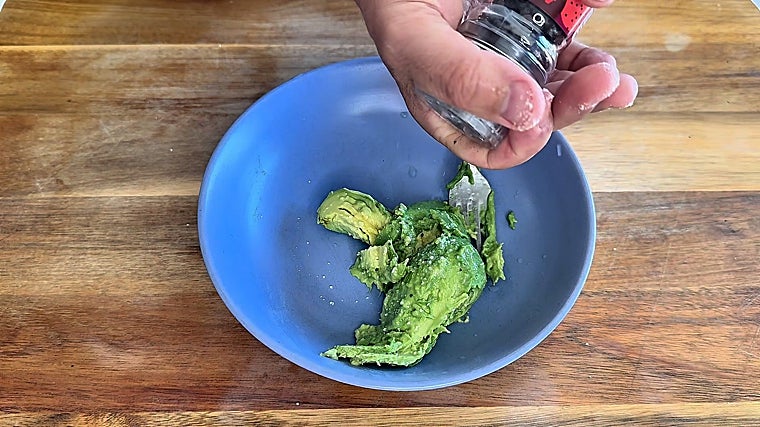 Abre un aguacate y con un tenedor vamos rascando la pulpa para romperla y luego la iremos pasando a un plato. Hacemos el proceso con las dos mitades. Añadimos un chorrito de zumo de limón, sal y pimienta. Machamos bien con el tenedor para que quede todo bien integrado.