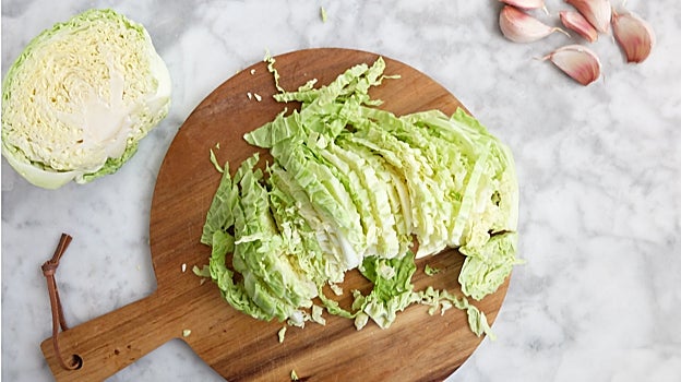 Para empezar, cortamos la col a la mitad, retiramos la parte central mas blanca y dura con la ayuda de un cuchillo y picamos el resto finamente. Tomamos las patatas, las pelamos y las cortamos en trozos iguales.