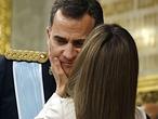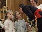 Llega el momento del saludo. Ha salido primero el Rey, seguido de su mujer, quien ha esperado unos instantes a que Felipe VI saludara a todos los asistemtes primero. A contibuación salen la Princesa de Asturias y la Infanta Sofía. Es una imagen muy emotiva en la que, además los Reyes nos han regalado unas imágenes muy emotivas: Felipe VI ha besado a su mujer y a sus hijas.