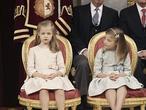Entre los detalles que nos está dejando la jornada está el de las Infantas. Las hijas de los Reyes se están caracterizando por una actitud muy correcta sin dejar de sonreír. Ambas visten un vestido de corte igual, pero de colores distintos.