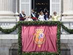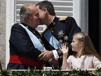 Don Juan Carlos y Doña Sofía salen ahora al balcón. Visiblemente emocionados besan a los Reyes y a sus hijas. Son los primeros en abandonar el balcón, ceciendo todo el protagonismo a los nuevos Reyes.