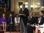 El Rey asegura que representa a una Monarquía «renovada». «Tenemos la necesidad de mejorar el legado actual porque odo tiempo político tienen sus propios retos. Aspiramos a revitalizar las instituciones, a que primen los intereses generales, a fortalecer la cultura democrática. Queremos que los ciudadanos sean el eje político». Para ello, se compromete a hacer honor a su juramento a la Constitución y a ser «un jefe del Estado leal y dispuesto a escuchar, a comprender, a advertir y a aconsejar, y también a defender siempre los intereses generales».