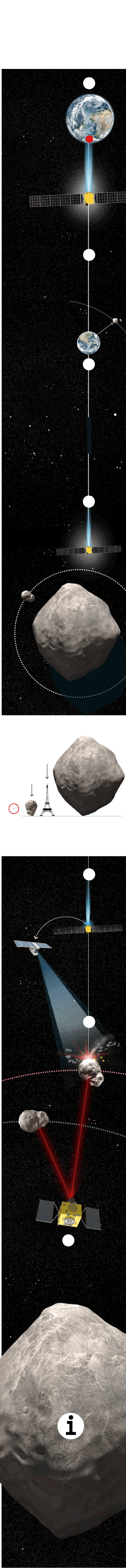 Lanzada en noviembre de 2021 a bordo de un cohete Falcon 9 de la compañía privada SpaceX desde la Base de la Fuerza Espacial Vandenberg en California (EE.UU.), la nave sin tripulación DART pesa unos 600 kilos, como un miura, y tiene el tamaño de un carrito de golf. Habrá recorrido 11 millones de kilómetros cuando previsiblemente impacte en el diminuto Dimorphos, de apenas 160 metros de diámetro, a una velocidad endiablada superior a los 6 km por segundo. Mientras, Dimorphos seguirá orbitando Didymos, de 780 metros de diámetro, cada 11,9 horas.
