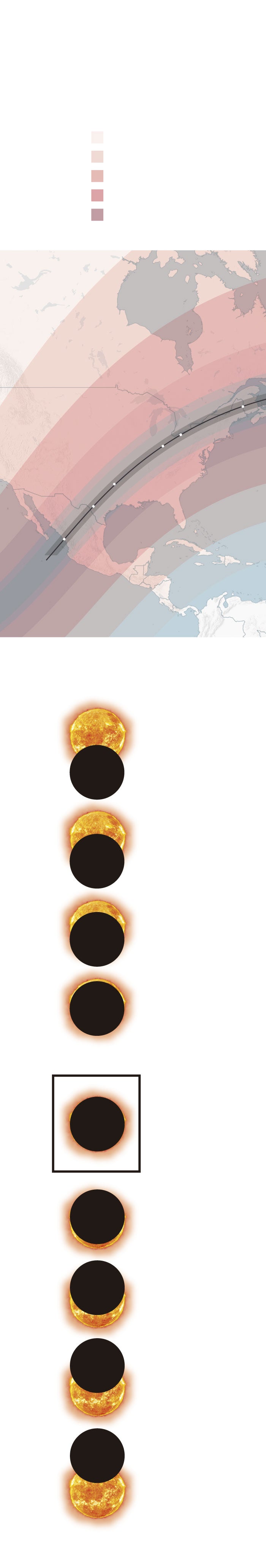 La expresión que repite todo el mundo estos días en EE.UU. es 'path of totality', 'senda de totalidad'. Es decir, la franja de territorio donde habrá eclipse total (en el resto del país será parcial). Se estima que en ella habitan algo menos de 32 millones de personas. Pero otros 150 millones de estadounidenses están a menos de 200 millas (320 kilómetros) de ella, una distancia que cualquiera puede cubrir con un coche en el mismo día para presenciar un fenómeno asombroso y que tardará mucho en repetirse.