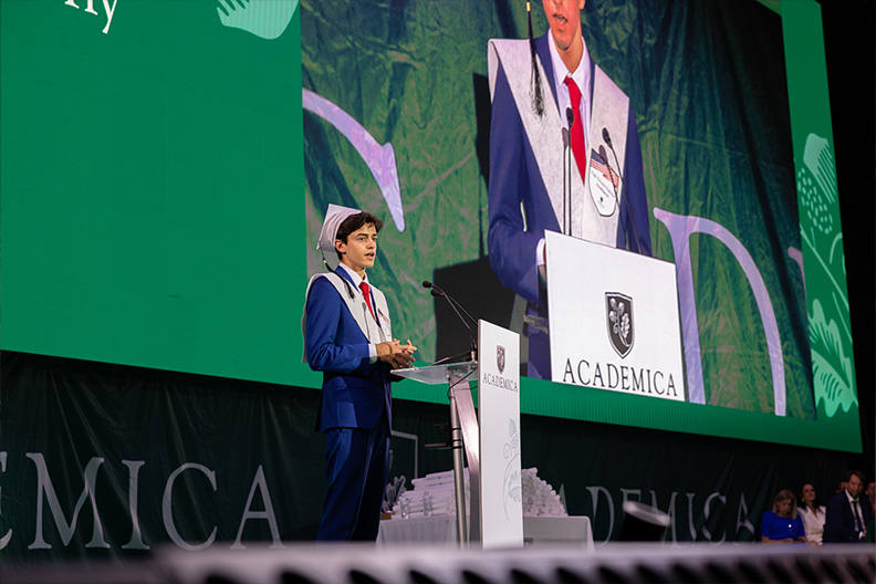 Valores, esfuerzo y trabajo bien hecho resaltados en la intervención de Fernando Zulueta, presidente y fundador de la institución y Maggie Fresen, vicepresidenta y fundadora (quienes graduaban también este 2024 a una de sus hijas en las escuelas de ACADEMICA en EE.UU.), subrayaron la importancia de “forjar una comunidad excepcional” y de continuar con esta comunidad, anunciando un regalo para los alumnos de la Class Of 2024 gracias a ACADEMICA y sus Fundaciones, del que disfrutarán durante su etapa universitaria. Y que fue comunicado por Nicolas Martínez, Lucas Azcue y Manny Pon tres “Alumni” de ACADEMICA en España y Estados Unidos, que han liderado una inversión de 2.000.000 de dólares en desarrollar este gran proyecto para los futuros universitarios.