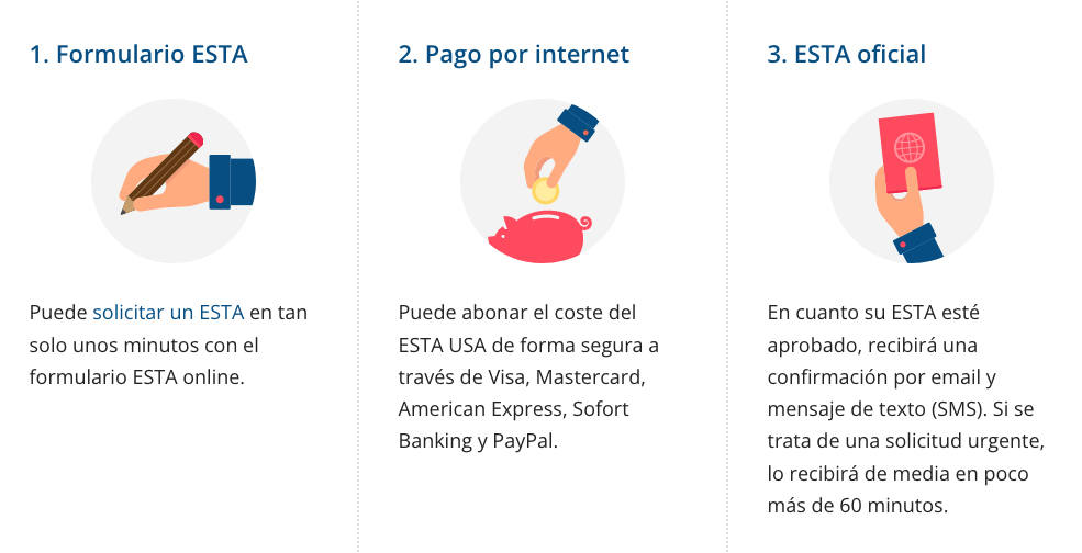 – Puedes pagar su ESTA de forma segura con Visa, Mastercard, American Express, Sofort Banking y PayPal. Una vez aprobada la solicitud, recibirás un correo electrónico y un mensaje de texto. El plazo medio de entrega es de 3 días. No es necesario imprimir nada.