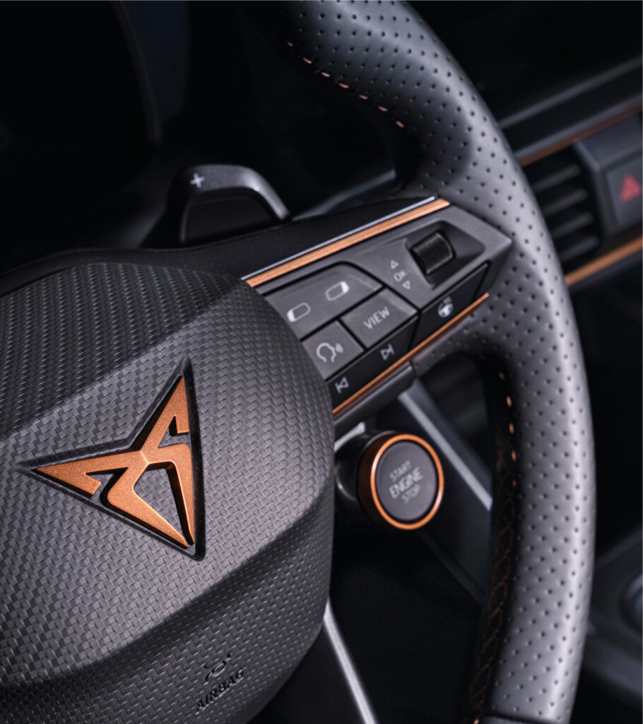 El interruptor de arranque del motor está situado en la parte derecha del volante. Cuando se acciona se pone en marcha la maquinaria de las emociones CUPRA.