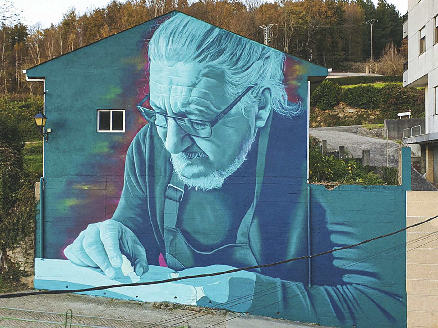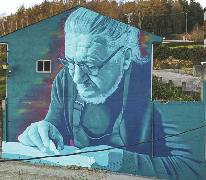 El ceño fruncido de Xermán y la dedicación con la que fabrica y repara los instrumentos pueden admirarse en el mural de gran tamaño que luce en Triacastela, una etapa que conduce a Sarria a través de una cadena de pequeñas localidades de tradición jacobea.