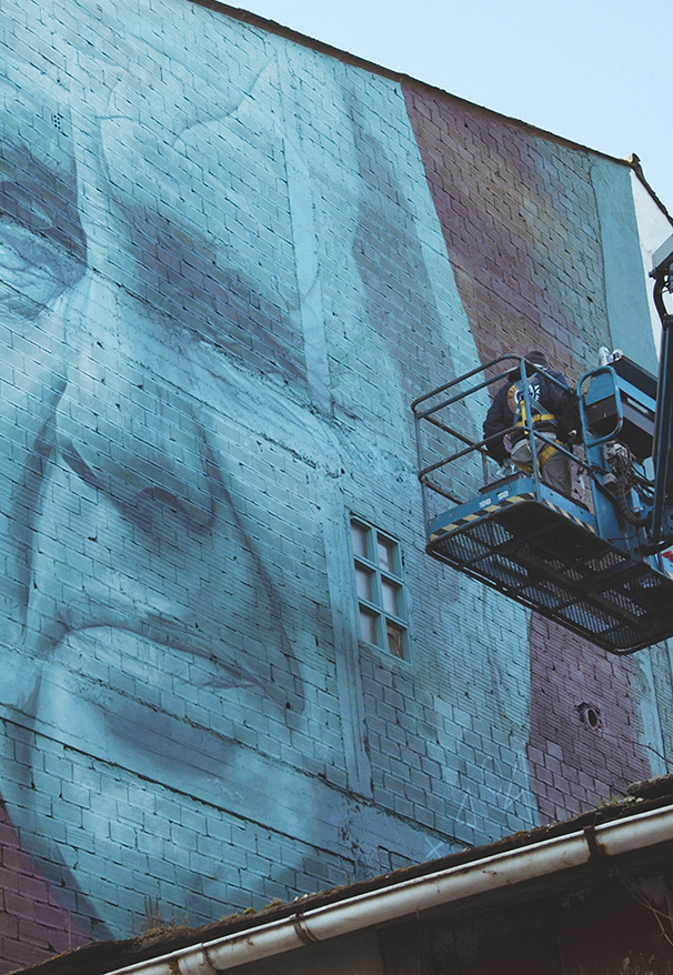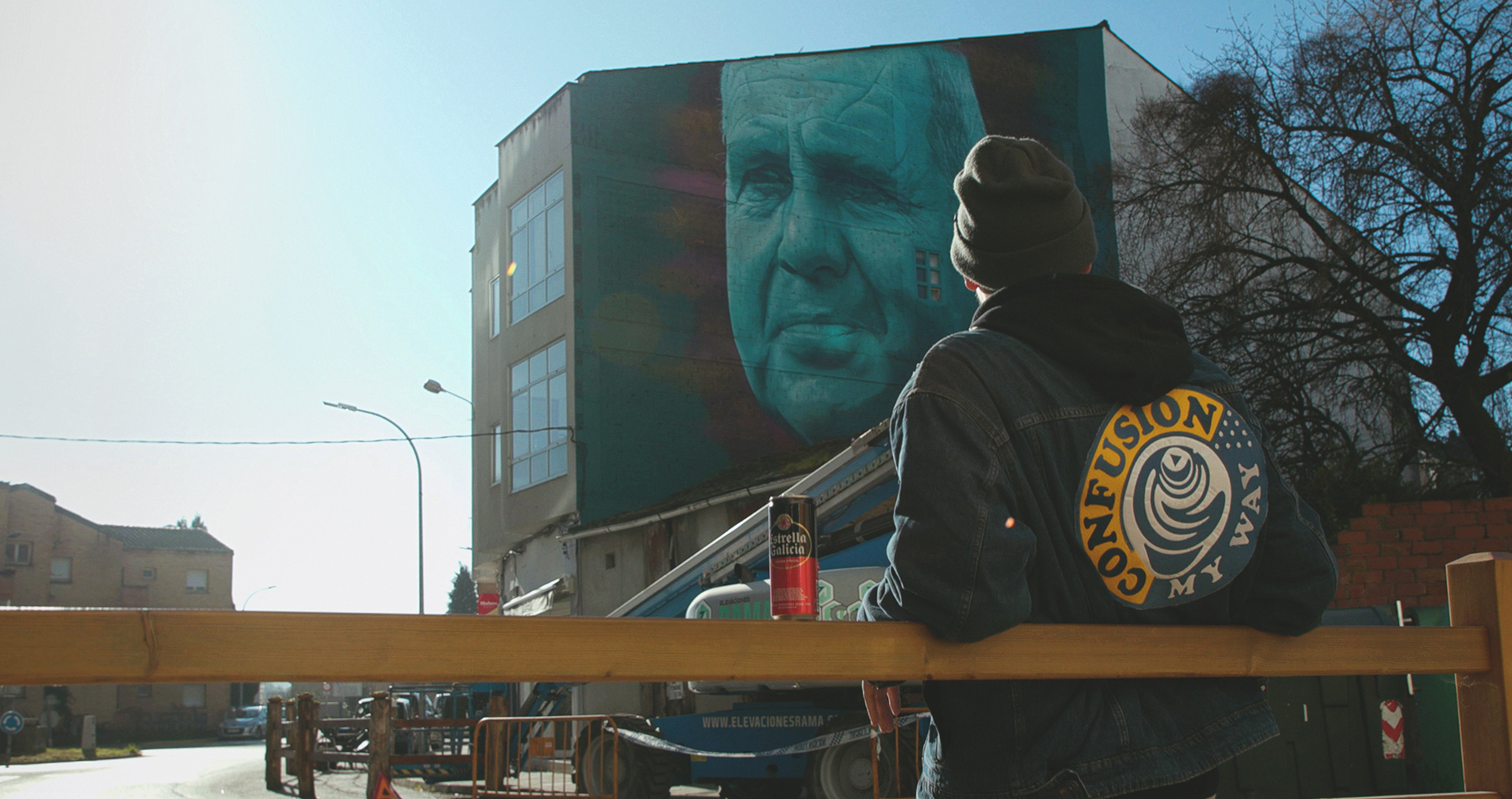 «Escapamos de los otros retratos que están con una acción o un objeto en la mano, y magnificamos su cara para representar que es un tío enorme, que te abre las puertas de su sitio, que ha sido revolucionario en sus conceptos. Me gusta mucho cómo quedó la zona de los ojos, le di especial interés, yo siempre empiezo por los ojos en las obras. Ese muro está muy bien situado porque nada más entrar en Sarria lo ves al fondo, en una pared que era horrible y se ha transformado completamente». Mon Devane, artista urbano que ha pintado los murales.