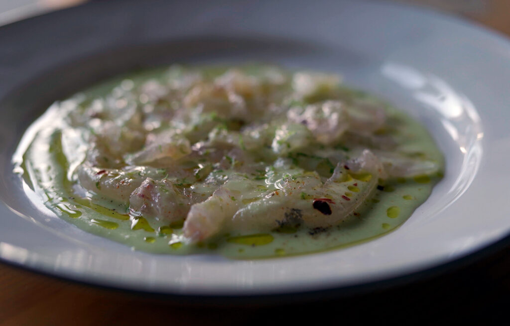 A la hora de elaborarlo, es necesario limpiarlo bien y a conciencia para sacar los lomos. Luego, se marina durante diez minutos en sal gorda, por ambos lados. Una vez eliminada la sal, se deja reposar en la nevera durante 2 horas. Laminamos el pescado con un corte fino de unos 2 milímetros y continuamos con la emulsión de pimiento verde. Esta verdura le aporta frescura al plato. Para ello, se corta en pequeños trozos y añadimos ajo, acompañados de vinagre. Todo ello lo trituramos a toda velocidad para obtener un puré con una textura fina. Después de añadir un poco de aceite de girasol, lo colamos por un colador de malla fina para eliminar posibles fibras o impurezas del pimiento en la salsa.