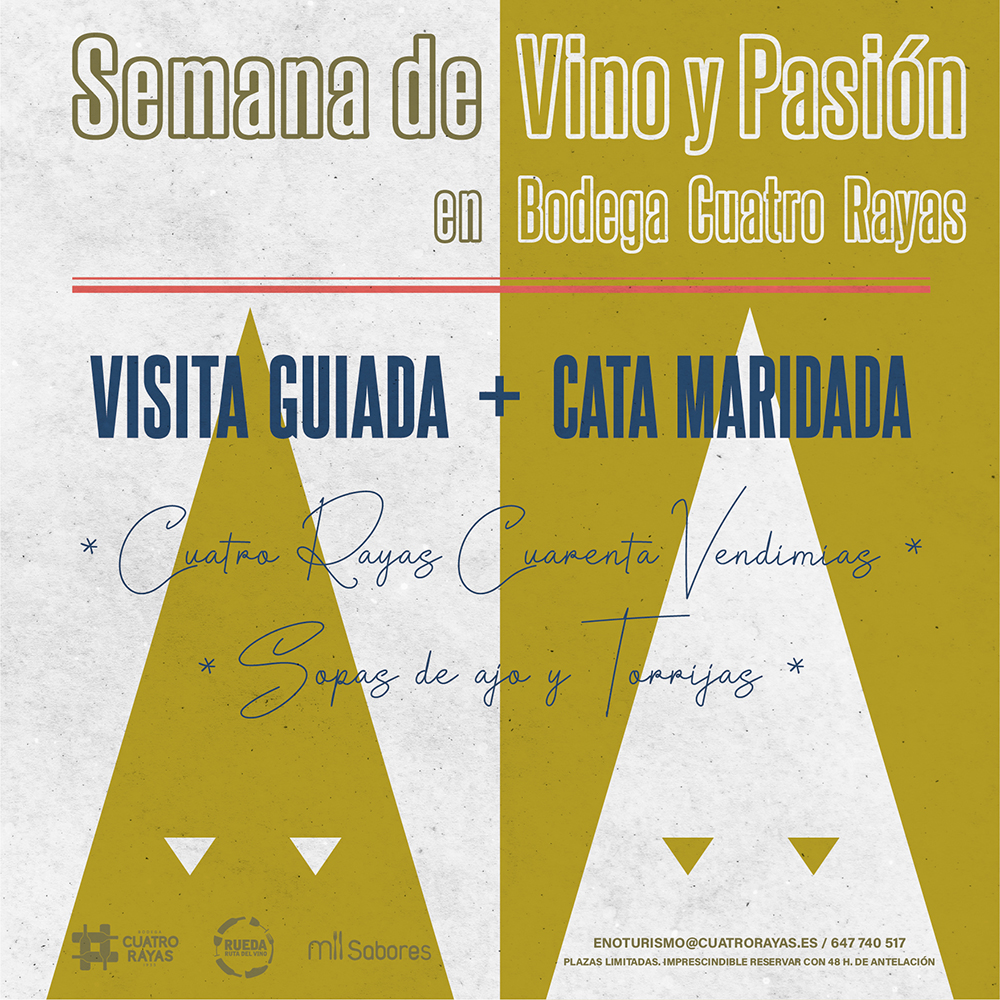 Actividad con plazas limitadas y previa reserva. Entradas disponibles para compra directa en la Tienda Online de Bodega Cuatro Rayas. Para ampliar información y reservar tu plaza, puedes contactar con el departamento de Enoturismo Cuatro Rayas (647 740 517 / enoturismo@cuatrorayas.es)