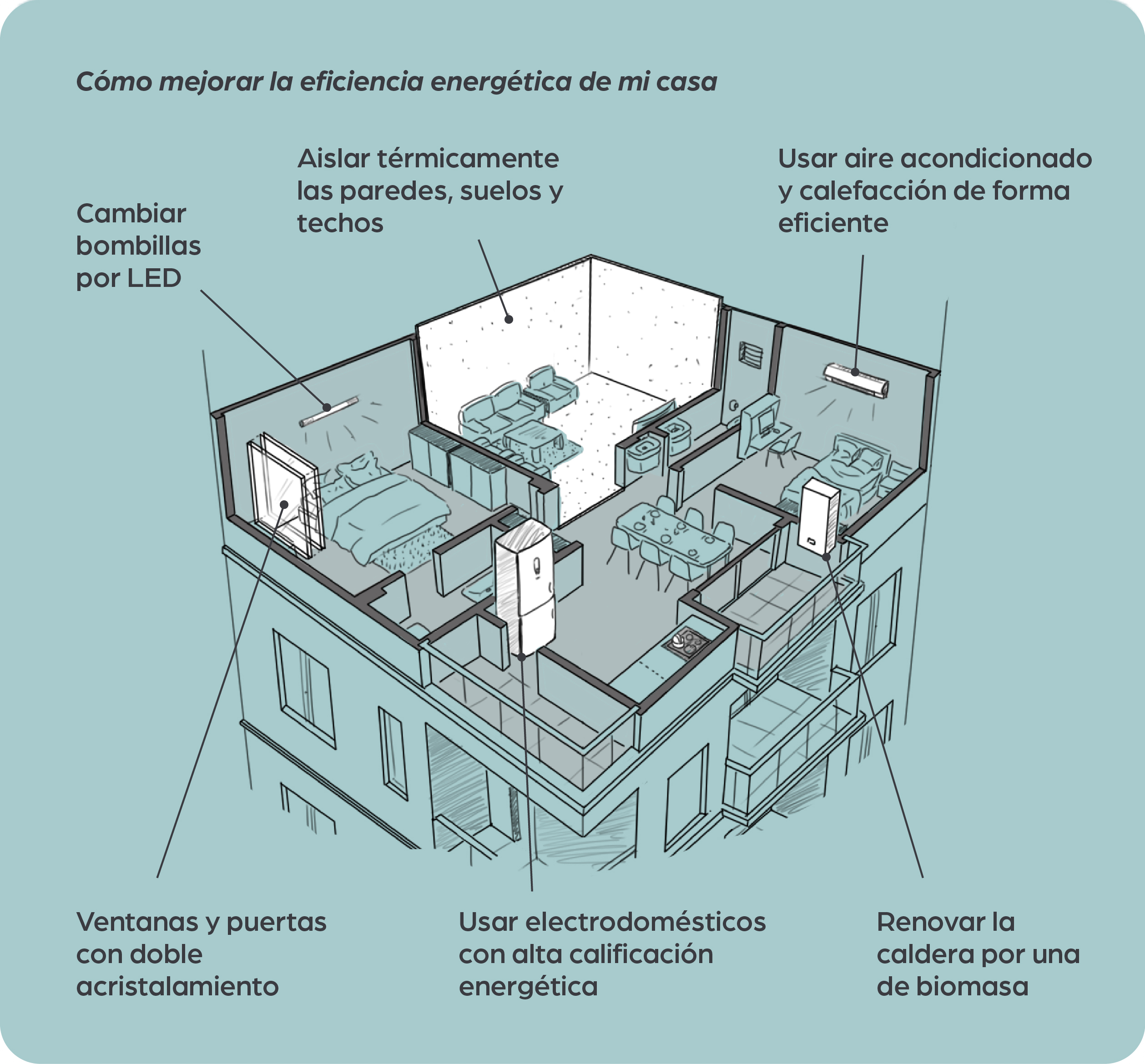 Existen aspectos importantes como las ventanas, que se recomiendan aquellas que tengan vidrio doble con cámara de aire intermedia, o las instalaciones de calefacción y refrigeración eficientes (radiadores de baja temperatura, bombas de calor, termostatos inteligentes…).