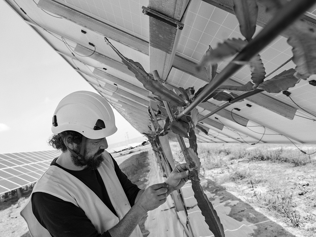 El día a día de José Enrique, supervisor de la planta solar de Totana (Murcia), pasa también por ver el estado de los cultivos entre paneles.