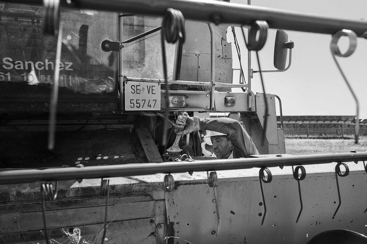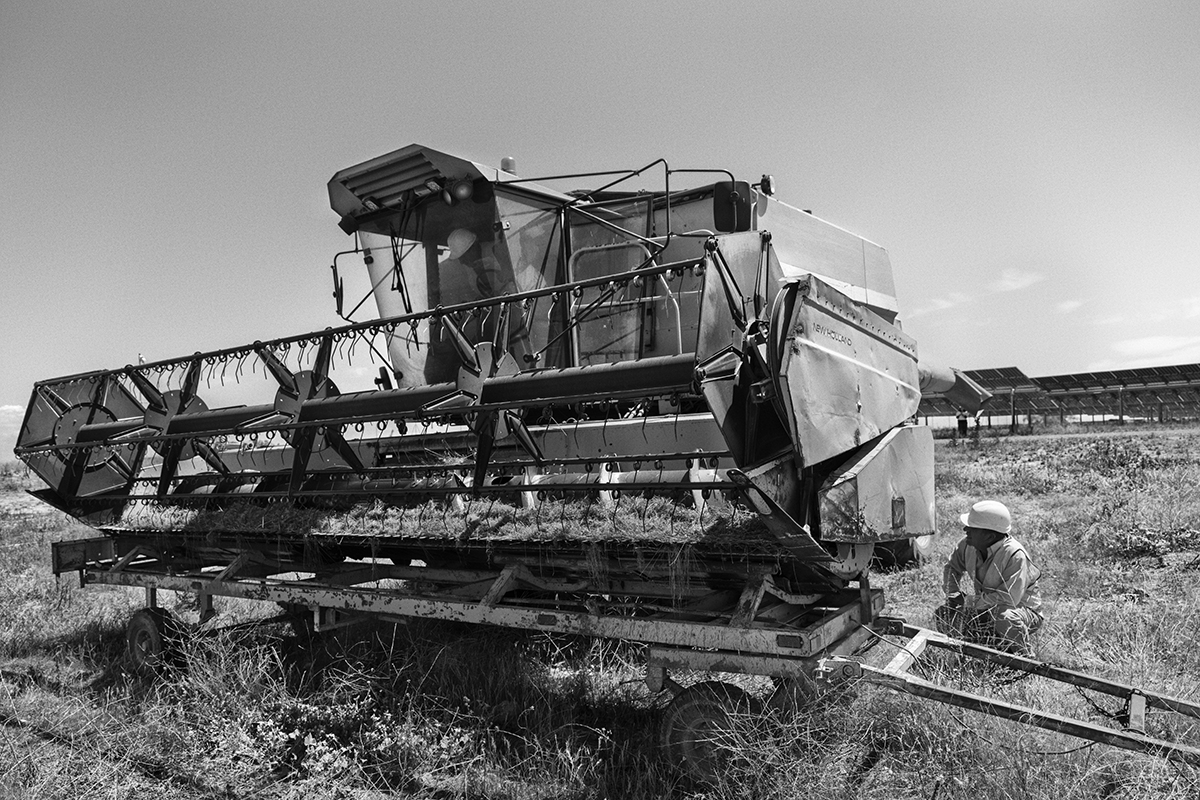 La cosechadora pasa rugiendo entre paneles solares, calculando milimétricamente cada movimiento