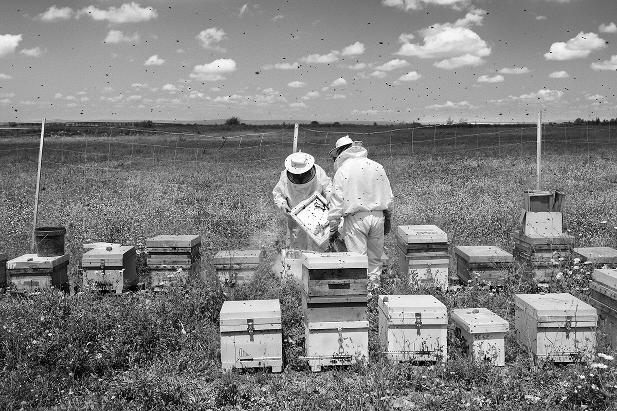 Juan, apicultor de cuarta generación, junto con su hijo (que ya representa la quinta generación), revisan sus colmenas ubicadas en la planta solar de Endesa que pueden llegar a producir 500 kilos de miel.
