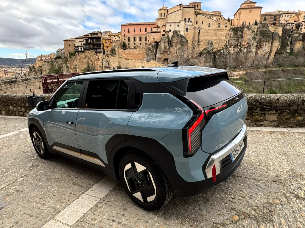 Por su parte, Cuenca -Patrimonio de la Humanidad- combina historia, naturaleza… y gastronomía, contando con lugares emblemáticos como las Casas Colgadas -balcones de madera sobre la hoz del río Huécar-, la Catedral de Santa María y San Julián, con espectacular fachada gótica inacabada, y un interior con una impresionante vidriera que llama la atención, como las tres pantallas unidas bajo el mismo cristal del Kia EV3. A la izquierda el cuadro de instrumentos digital, de 12,3” con varios modos de visualización, y a la derecha otra táctil del mismo tamaño, pero con algunas zonas debajo que sirven como acceso directo a las funciones principales. En medio, una tercera pantalla de 5” reservada para los ajustes de climatización.