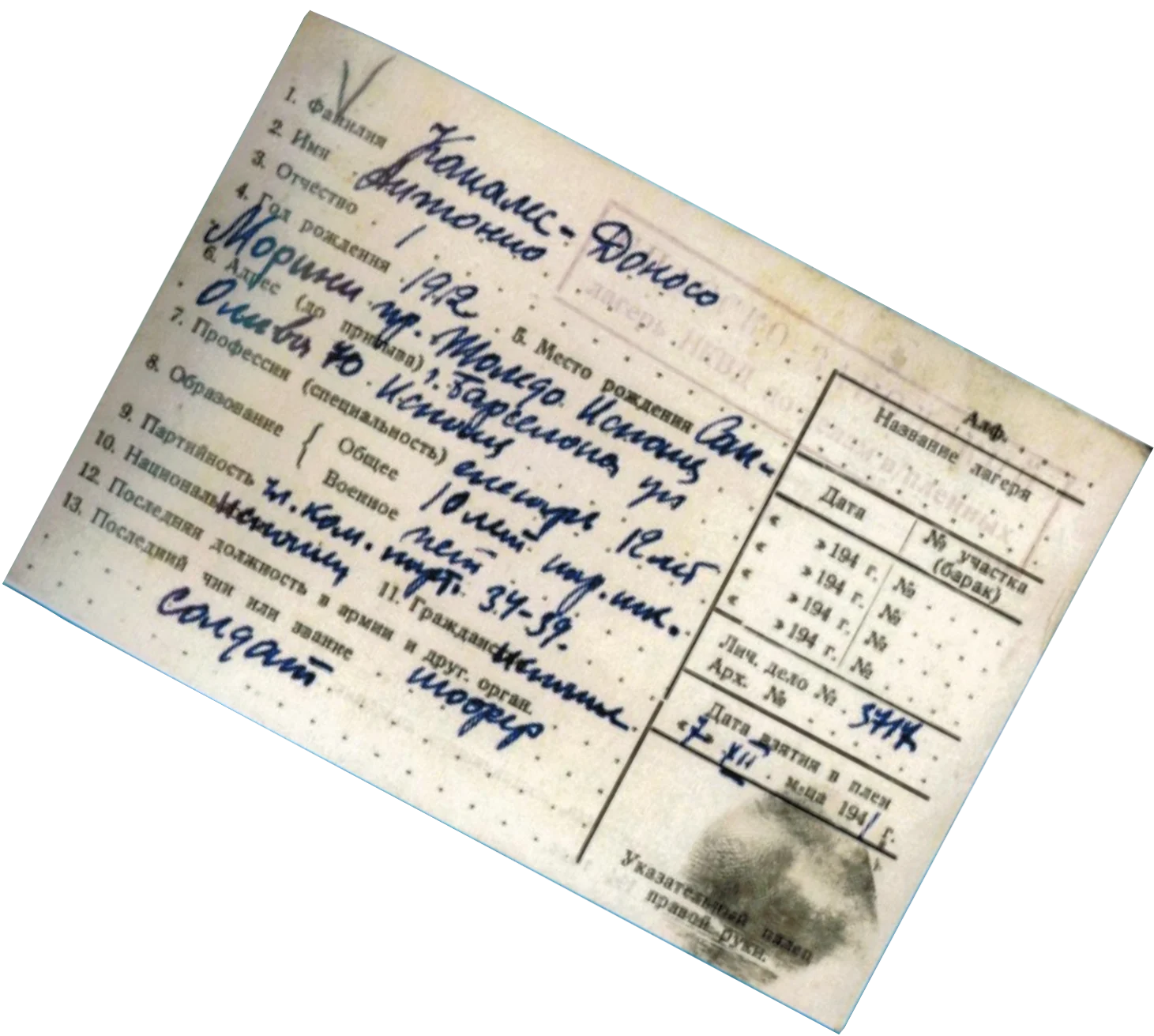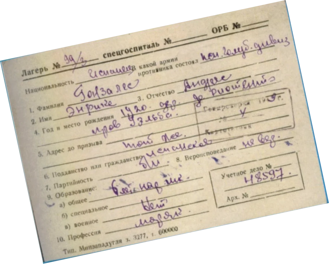 Bousa Carras Manuel 1924 A. Momforte, prov. Lugo El mismo Campesino Soldado tirador 10.02.43 Krasny Bor, Frente Leningrado -; Vargad Julián León 1921 A. Cariño, región Berganzo, prov. Castilla, España Madrid Albañil Soldado tirador 10.02.43 Kolpino, Frente Leningrado -; Barrigia Eugenio José 1921 El Ferrol, prov. La Coruña El mismo Carpintero Soldado raso 10.02.43 Kolpino -; García Hipolito Juan 1922 A. Almuadrin, prov. Cáceres Badajoz, Avenida Juaquen Caniga Campesino Soldado tirador 10.02.43 Kolpino -; García Soter Víctor 1918 A. Sanpedro, prov. Sevilla A. Monpressa, prov. Baritone Chofer Soldado enlace 27.12.1943 cerca de Volkhov -; García Victoriano Bríxido 1921 Toledo El mismo Albañil Soldado 11.02.1943 A. Krasny Bor, prov. Leningrado -; Berrero Naranjo Eustanio 1917 A. Asuada, prov. Madrid, España El mismo Campesino Soldado División Azul 269 cerca de Novgorod -; González Santos Bernardino 1916 A. Novo, prov. Obedo El mismo Mecánico tornero Soldado 10.02.1943 Kolpino, prov. Leningrado -; González Enrique Andrés 1920 A. De Río-Tiento, prov. Uzulba El mismo Marinero Soldado tirador 10.02.1943 Kolpino -; González Bentureo José 1923 Tarragona A. Cabero, prov. León Herrero Soldado tirador 11.10.1943 Narva -; González-Moreno Francisco 1914 A. Cardennia, prov. Córdoba, España El mismo Panadero Com. Min. 6-n Cerca de Novgorod 8º reg 2 B-n División Azul -; González Francisco Moreno 1914 A. Cardennia, prov. Córdoba, España El mismo Panadero Suboficial Comandante 07.12.1941 Novgorod -; Grande Gregorio Alejo 1921 A. Belmonte, prov. Cuenca El mismo Conductor Soldado conductor 10.02.1943 Kolpino -; Granja Redosino 1924 Orense, calle Dontémalo 6 El mismo Trabajador Soldado tirador 10.02.1943 Kolpino -; Guión Antonio 1923 Prov. Pontevedra, A. Mondaris Prov. Pontevedro, A. Mondaris Mecánico Soldado tirador 10.02.1943 Kolpino -; Juanin Guteres-Peres Emilio 1920 Madrid, España Madrid, calle Fero Carril 15 Carpintero ebanista Soldado División Azul 269 p/p 14º reg cerca de Novgorod -; A. Guardo José José 1920 Prov. Córdoba, A. Cuntiza, calle Córdoba El mismo Zapatero Soldado tirador 07.07.41 región de Novgorod -; Días Juan Agustín 1925 Hinojosa del Bas Prov. Badajoz Jornalero Soldado tirador 10.02.42 Kolpino -; Dobal Federico 1923 A. Villar-Tartin, prov. Pontevedre El mismo Zapatero Soldado tirador 10.02.1943 Krasny Bor -; Domínguez Timoteo Francisco 1922 Madrid El mismo Cerrajero Soldado tirador 10.02.1943 Kolpino -; Echevarna Antonio Moriano 1908 Bilbao Región de Valencia Cocinero Suboficial Com. pelotón 10.02.1943 cerca de Leningrado -; Iglesias Antonio José 1923 A. Riotinto, prov. Lugo, España El mismo Herrero Soldado tirador 10.02.1943 Kolpino -; Igruslo Manuel José 1922 Prov. Joan (España), A. Torre-Don-Jimeno El mismo Trabajador Soldado tirador 10.02.1943 Kolpino -; Isidrdo Cesario Gregorio 1919 España, Barcaldo, calle Tewaze nº 20, prov. Barca El mismo Panadero Soldado sanitario 11.02.43 Krasnovo Bor -; Calvache Alfredo Francisco 1924 España, Almería El mismo Trabajador Soldado tirador 10.02.43 Leningrado -; Calvo-González Bisente 1913 España, A. Beta-Nuen, prov. Delacorunia El mismo Suboficial en flota Soldado radiotelegrafista Cerca de Novgorod -; Calvo-Bellisilvo Zuseibio 1917 A. Boshenbavich, prov. Sharda, España Madrid, calle Matezlonei 10 Comerciante Soldado conductor Cerca de Novgorod -; Canales Antonio Eulokio 1914 Barcelona, pueblo Sant-Martin-de-Montepadan, prov. Toledo, España El mismo Mecánico de cine Teniente tanquista 06.11.41 en región de Leningrado -; Lopes Luis Gomero 1925 A. Lezuza, prov. Albacete El mismo Zapatero Soldado tirador 10.02.43 Kolpino -; Lopes José Candido 1921 España, Granada El mismo Marinero Soldado raso 10.02.42 cerca de Leningrado -; Makeda-Aragine Miquel 1911 España, Marsella, prov. Siainlin Siainlin Zindra-Marin nº 1, España Carpintero Soldado ametrallador Cerca de Novgorod -; Makosanche Lorencio Maximo 1916 Pescusa, prov. Cáseres, España El mismo Molinero Soldado Com. tirador Novgorod -; Martínes Manuel Manuel 1921 A. Tauste, prov. Saragosa El mismo Jornalero Soldado tirador 10.02.43 Kolpino -; Matin Daniznl Romento 1922 España, Barcelona, región Catulunin, calle Lone-de-vega El mismo Mecánico Soldado tirador 10.02.43 Krasny Bor -; Mata-Fero Antonio Xilio 1924 España, Lora, prov. Sichilin El mismo Sin profesión Soldado raso Cerca de Novgorod -; Mateo Francisco Joa 1917 España, Amorin El mismo Sin profesión Soldado granadero 10.12.41 Taganrog -; Matro Raszazlb Manuel 1919 España, Valencia de Alcantara, prov. Cáseres España, A. La-Cantnlb cerca de Valencia Trabajador Soldado tirador 10.02.43 Kolpino -; Mendes Emilio Emilio 1920 España, Badajoz, calle Del Castebo El mismo Panadero Soldado enlace 11.02.43 región Kolpino -; Moralb Manuel Jme 1921 Cormana, prov. Siviidia, calle Anton Guderia El mismo Herrero Soldado tirador 11.02.43 región de Leningrado -; Morlian Aesedirio Benito 1921 Madrid El mismo Albañil Soldado zapador 11.02.43 Kolomino - Leningrado -; Munes-Juanin Francisco 1920 España, A. La-Roza, prov. Albezera El mismo Trabajador forestal Soldado cocinero 10.02.43 Kolpino -; Munis Juan 1916 A. Alhegira, prov. Cadis Uelsa Pescador Soldado tirador 10.02.44 Kolpino -; Olada Julio Julio 1925 A. Zelm, región Alicante, España El mismo Zapatero Soldado tirador 10.02.43 Kolpino -; Oliisa Mattias Pedro 1912 España, A. Telde, Islas Canarias África, Caiz Campesino Sargento Com. pelotón 10.02.43 Krasny Bor -; Oliiser-Sevilliano José 1921 A. Tomarli, prov. Sevinis El mismo Panadero Soldado tirador 08.11.41 cerca de Novgorod -; Oliibe Weshisiano Diego 1922 Seviidia, calle Tomirli 13, España El mismo Panadero Soldado Cap. pelotón 08.12.41 Novgorod -; Ortis Faustino Wermo 1912 España, Bitoriia El mismo Jornalero Sargento Com. pelotón 10.02.43 Kolpino -; Piñedro-Álies Enrikke 1912 Bomba, Rep. Argentina Odessa Marinero artillero - Norilsk 20.01.42 -; Poket Joakwe Juan 1922 A