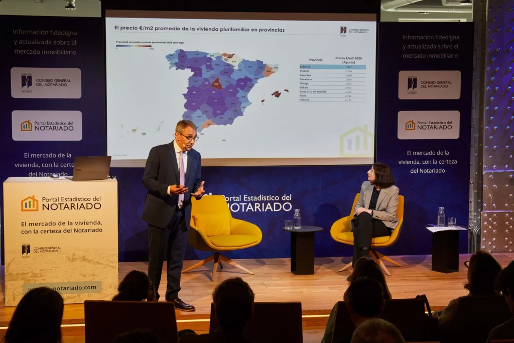 La presidenta del Consejo General del Notariado (CGN), Concepción Pilar Barrio Del Olmo, y el director del Centro Tecnológico del Notariado, Alberto Martínez Lacambra, presentaron el miércoles 23 en el Espacio Fundación Telefónica el nuevo Portal Estadístico del Notariado. Esta iniciativa, creada a partir de los datos del Índice Único Informatizado Notarial (la segunda mayor base de datos de España, con más de 170 millones de documentos notariales) se apoya en una plataforma de uso gratuito (www.penotariado.com) mediante registro, con datos reales, entre otros, del precio de la vivienda desde 2007 hasta agosto de 2025, basándose en los datos contenidos en las escrituras de compraventas autorizadas ante notario.