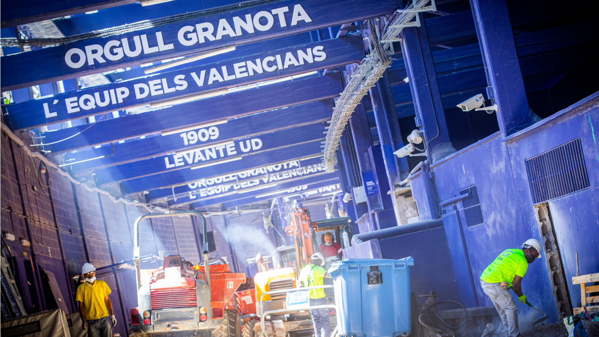 El Levante inició la primera fase de las obras de su estadio el 1 de julio de 2019. Ocho meses después, España entró en estado de alarma y el gobierno decretó el confinamiento por la pandemia del Covid 19. “Los trabajos iniciales de la obra se basaron en el refuerzo de pilares (cimentaciones), por lo que en la parte final de 2019 y principios de 2020 podíamos seguir teniendo público sin problemas. Nuestra idea era acabar la temporada 2019/20 y que en el verano de 2020 la maquinaria de obra se colocase ya dentro del estadio, en el terreno de juego, y acometiese la colocación de la cubierta. Con la pandemia, la planificación se nos trastocó completamente”, relata Cervera.