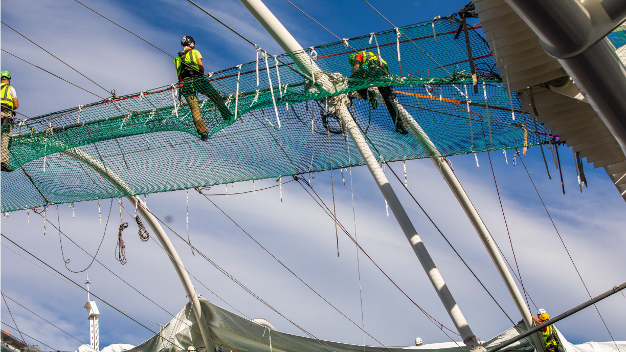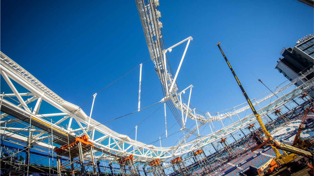 Un proceso que no ha sido nada fácil, ya que la colocación de la nueva cubierta ha supuesto un gran reto. “Costó crearla y además hay que tener en cuenta que tenía que albergar esos elementos necesarios para una buena retransmisión: iluminación, altura para la cámara aérea… etc. Pero el principal problema era establecerla en el campo. Para eso hemos usado una tecnología de estructura bastante avanzada. Una cubierta ligera de cables, que pesa poco y que tuvimos que apoyarla en unos pilares que creamos fuera de la estructura original”, resume César Azcárate.