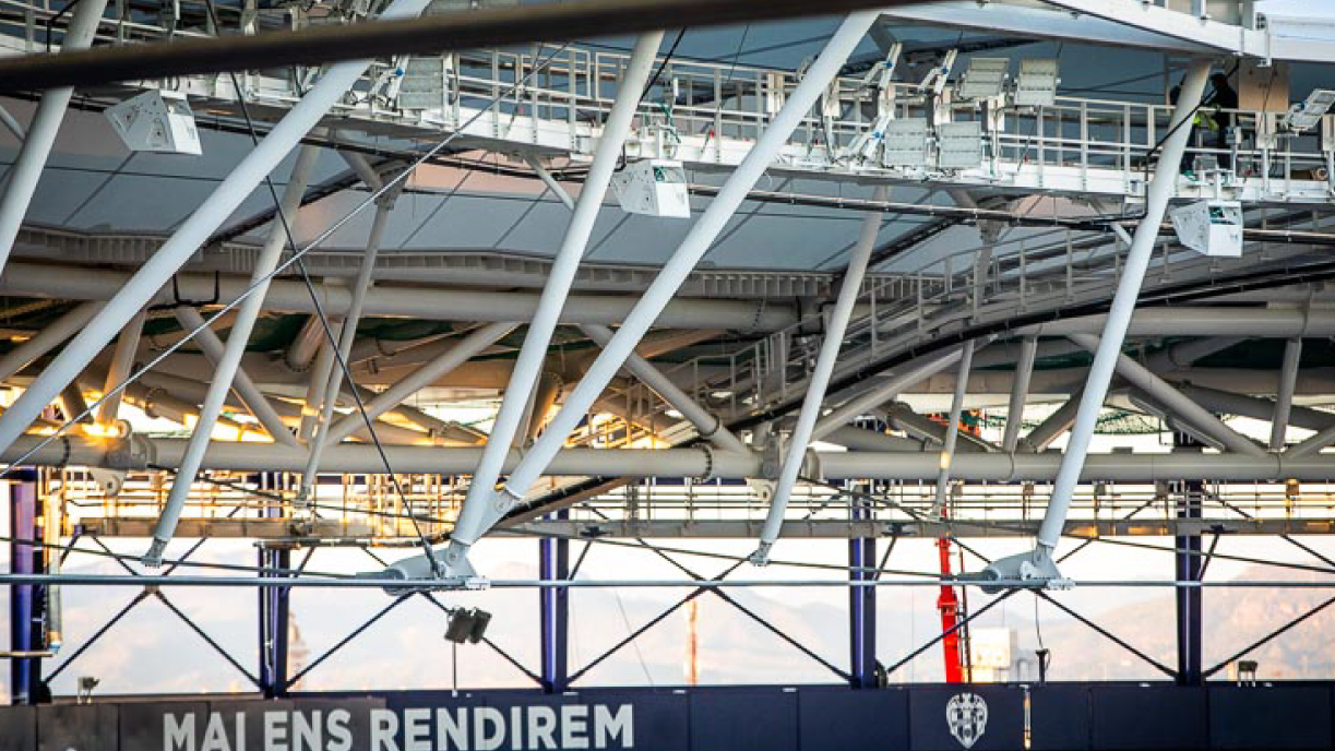 El Levante tenía claras sus necesidades: mejorar la experiencia de los aficionados y adaptar el estadio a los patrones de las retransmisiones televisivas de LaLiga. Para lo primero, se planteó una modernización de varios elementos. “Con la nueva cubierta vamos a ofrecer un mayor confort a los espectadores con una mejor iluminación, megafonía y dos videomarcadores de grandes dimensiones. Esto va a contribuir a crear un clima de entretenimiento que fomente aún mas las asistencia al estadio. Además, cuando la reforma esté completa se mejorará sustancialmente las líneas de negocio del estadio, tanto los días de partido como los de no partido”, comenta Luis Cervera, director de Operaciones y Proyectos del Levante UD.