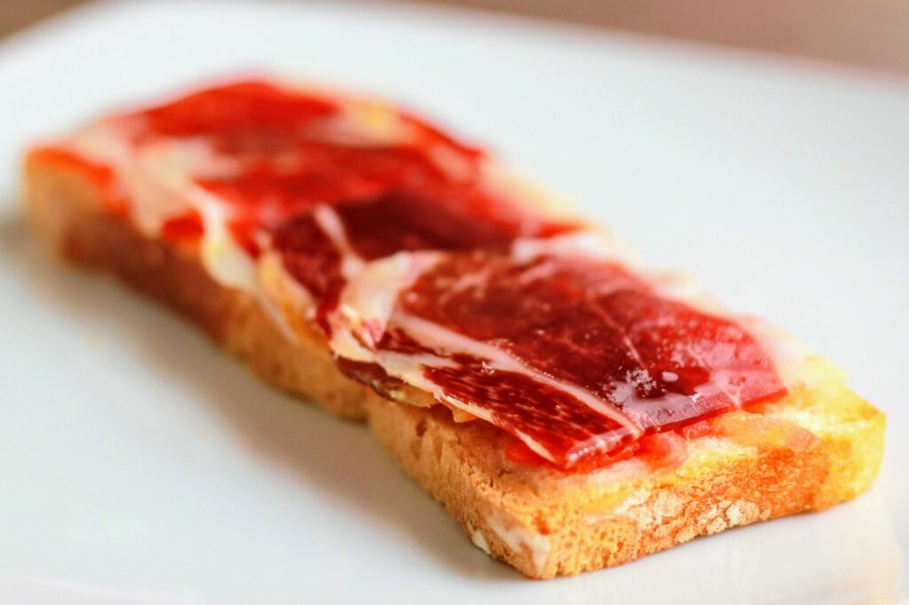 Tosta de jamón: tostamos el pan y, una vez que se empieza a dorar, se le echa un poco de aceite y sal. Cortamos unas rodajas de tomate y se las ponemos encima. Devolvemos el pan a la zona de calor para que el tomate se caliente. Se corta un poco de jamón ibérico, se pone por encima y se termina dando un último golpe de calor.