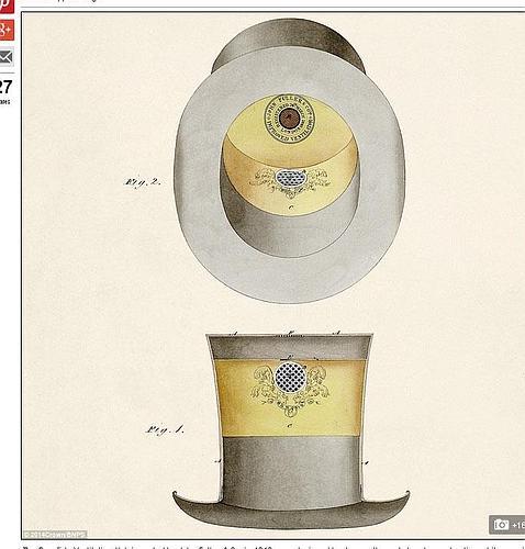 2-Un sombrero de copa con aire acondicionado . Por entonces, una de las mayores preocupaciones de los británicos era cómo llevar la cabeza bien ventilada y poder seguir poniéndose su precioso sombrero . Por ello, un inventor incluyó en uno de ellos una rejilla metálica que atravesaba la tela.
