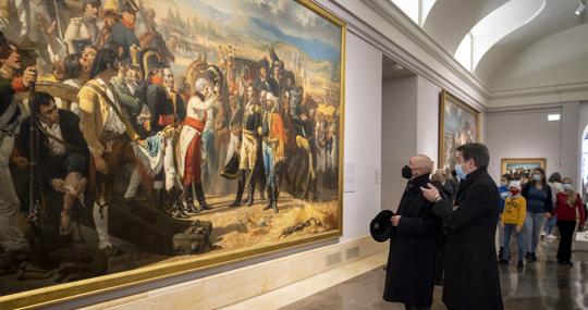 Caminamos sin dejar de comentar escenas como la muerte de Viriato. Antes los ropajes de las pinturas se elegían por aproximación. En ‘La rendición de Bailén’ de Casado del Alisal , ocurre lo mismo: «Percibimos la soledad del oficial francés que se rinde a Castaños en Bailén -resume Pérez-Reverte-. Cualquiera puede acercarse a esta imagen, la pintura facilita el acceso no solo al arte si no a la memoria. Una pintura contemporánea es interpretable y puede necesitar cierto conocimiento. Ante estos cuadros cualquiera puede entender , es muy generosa intelectualmente, nos impresiona a todos por igual, porque no es la pintura sólo sino lo que refleja , que puede ser la locura de Juana la Loca, la manera de afrontar la muerte de Torrijos y sus compañeros, la dureza del trabajo, cualquier tema».