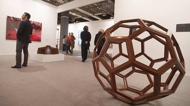 BELÉN DÍAZ No hay día en que deje de ser noticia: o le arrestan, o expone en Alcatraz, o se rompe una pieza de una exposición... O expone en ARCO. Es siempre uno de los platos fuertes de la galería Ivorypress. En primer plano de la imagen, su obra «F-Size» (2011), en madera. Cuesta 200.000 euros. Por cierto, vimos varios puntos rojos en la galería. Ha vendido obras de Uslé, Elespe...