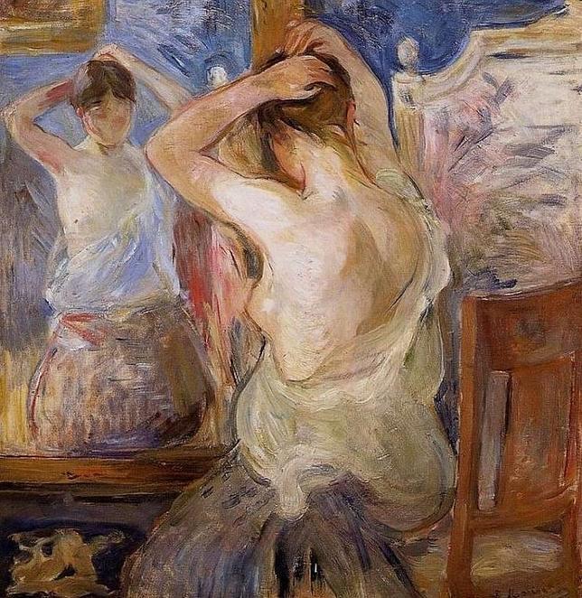 foundation pierre gianadda, martigny Berthe Morisot (Bourges, 1841-París, 1895) dedicó su vida a la pintura en una época en la que el papel de la mujer estaba socialmente acotado al ámbito doméstico. Morisot rompió con los estereotipos y se convirtió en la primera mujer en acceder al círculo de los impresionistas. En este retrato, la modelo carece de rostro. La mujer se está arreglando y se mira en un espejo que no les permite ver su verdadero rostro, su autentica identidad.