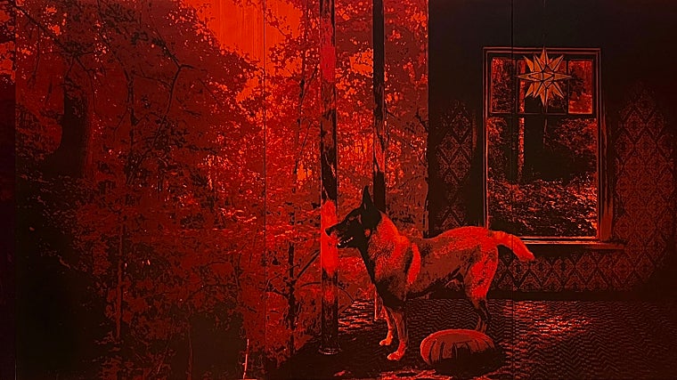 —Otro de los ejes que ha habido en el desarrollo de mi lenguaje en estos últimos años ha sido el juego entre lo que entendemos por cultura y lo que entendemos por Naturaleza. En el cuadro del estand se percibe perfectamente. Este está compuesto por dos espacios extremos: uno que es un salón en el que hay unos elementos que reconocemos como familiares pero ubicados en un contexto de cierta extrañeza. Algo que es cercano ha perdido su sensación de familiaridad. Hay una anomalía: el salón está abandonado, como en ruinas… En la otra parte está el perro, que ha atravesado toda la escena y que, desde un lugar mucho más modesto, mucho más pobre, mira con una cara sonriente lo que ve en ese salón. Y para llegar allí, para pasar al otro lado, ha tenido que atravesar un bosque, ha pasado a través de la Naturaleza. ¿Qué significa esto? ¿qué conceptos de cultura y de Naturaleza son los que a mí me mueven?