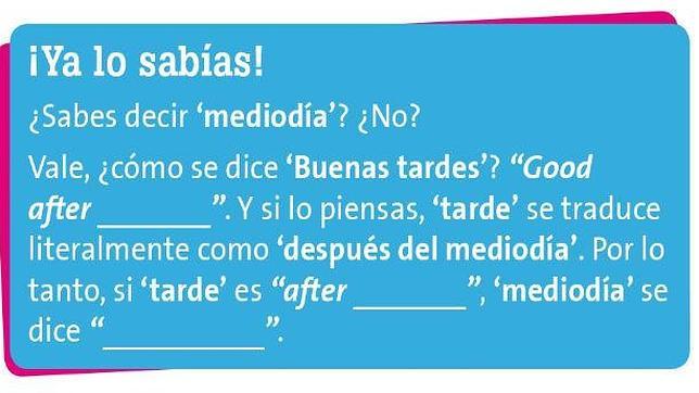 this book is the milk Este es otro de los ejemplos que podemos encontrar en el libro. Tal y como se expresa, «buenas tardes» se dice good afternoon» por lo que «mediodía» se dice «noon».