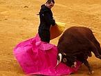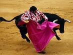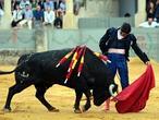 Ya está el quinto en la arena, de la ganadería de Cuvillo, flojo y de embestidas desiguales, mansote y como reparado de la vista. Manzanares brinda su faena al público. Suena Cielo Andaluz. Hace una faena de recursos y pulcra. Espadazo. Oreja.