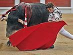 Rafaelillo entusiasma con el saludo genuflexo, de estampa antigua, con una torera media. Parecía que iba a embestir y lo brinda. Pero es difícil, se vuelve rápido y le pone en apuros en la meritoria lucha. Pinchazo y estocada al encuentro. Saludos.
