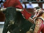 Embiste con mucha fuerza y Ureña aguanta en el capote. El murciano traga mucho en una difícil pelea. Sufre dos volteretones y está la borde de la cornada. Pinchazo en la suerte de recibir y estocada, donde el toro le pega un pitonazo en el pecho. Saluda una ovación.