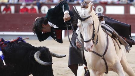 En el segundo, muy noble, Diego Ventura pone al público de pie con «Nazarí», su estrella, que lleva cosido al toro dos vueltas completas y torea con la grupa. «Fino» mantiene el entusiasmo con quiebros impecables y piruetas, muy en corto. Una faena magnífica, de dos orejas, pero mata a la segunda y corta una. Aunque el quinto pega derrotes, el extraordinario «Sueño» embelesa al público con «muletazos» por los adentros y quiebros de gran aguante. «Chalana» arriesga mucho. Mata a la segunda y se repite la historia: una oreja, que, si acierta en la suerte suprema, hubieran sido dos. Abre la Puerta Grande.