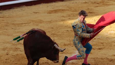 Dispuesto a no dejarse ganar la pelea salió Julio en el tercero, al que le cortó dos trofeos. Los primeros muletazos fueron de rodillas antes de sacarlo al centro del anillo donde se templó en el toreo en redondo. Igual que en el inicio, abrochó la faena «de hinojos», clavado en el albero. Otra oreja se llevó del sexto y aunque el momento más emocionante había llegado en el brindis aún quedaba ver a Julio hacer el salto de la rana. Se llevó una fea voltereta por fortuna sin consecuencias.