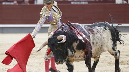 Ya está en el ruedo el quinto, Tremendo, melocotón, de 505 kilos. Diego Carretero comienza con el cartucho de pescado, pero pierde la muleta. Sigue a izquierdas en una faena de querer, con pasajes ilusionantes, pero también se observa el verdor lógico del albaceteño. En el epílogo de faena, por bernadinas, sufre un volteretón tremendo. En la arena, los pitones le destrozan la taleguilla y le dejan toda su zona varonil al descubierto, pero parece que no va herido. Le cubren con una toalla las zona y vuelve con valor por bernadinas. Mata de pinchazo y estocada. Saludos con división.