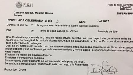 El novillero resulta herido en la región cervical derecha y en el muslo; también tiene fractura de clavícula