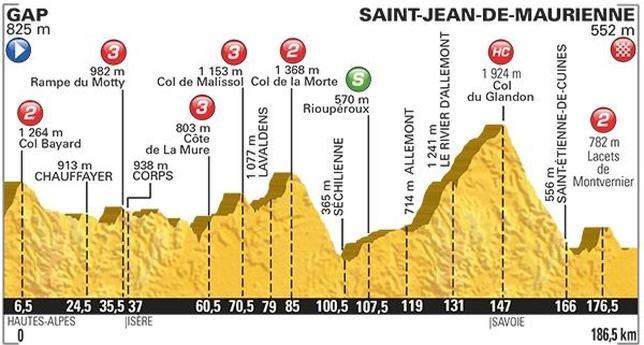El jueves la carrera llega a Saint Jean de Maurienne tras superar siete puertos, entre ellos el interminable Glandon (21,7 kms al 5,1%), que producirá un gran desgaste, y la Lacets de Monvernier, muy exigente con 3 kilómetros al 8 por ciento antes de la llegada. Una etapa ideal para un ataque desde lejos para los que hasta ahora han fracasado con Froome en las distancias cortas, ya que al Sky le resultará muy difícil controlar la carrera.
