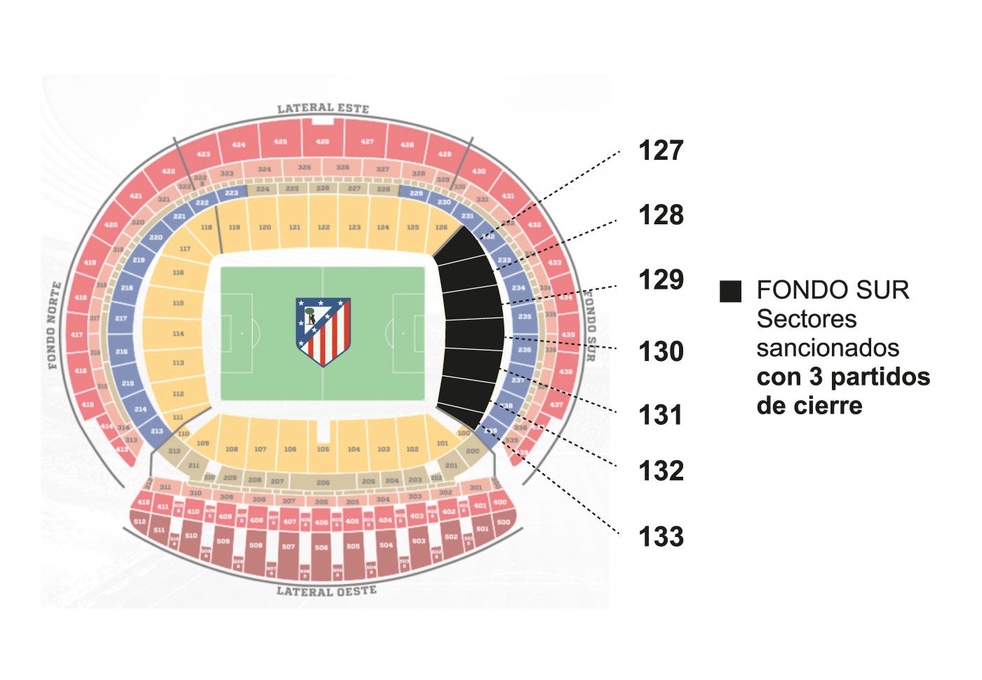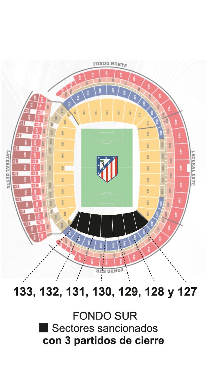 «La clausura parcial afectará a los sectores 127, 128, 129, 130, 131, 132 y 133, que conforman el 'Fondo sur bajo' al que se refiere el acta arbitral, y se cumplirá en los términos previstos en el artículo 57.1 Código Disciplinario de la RFEF».