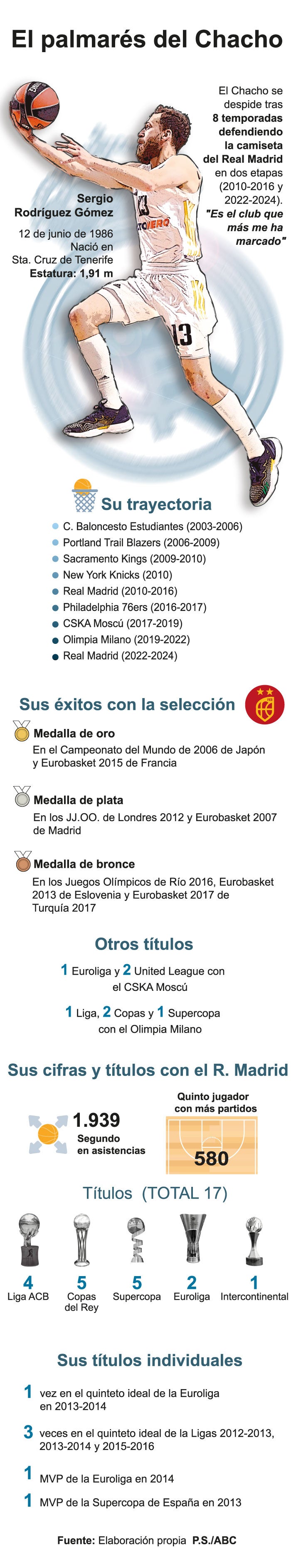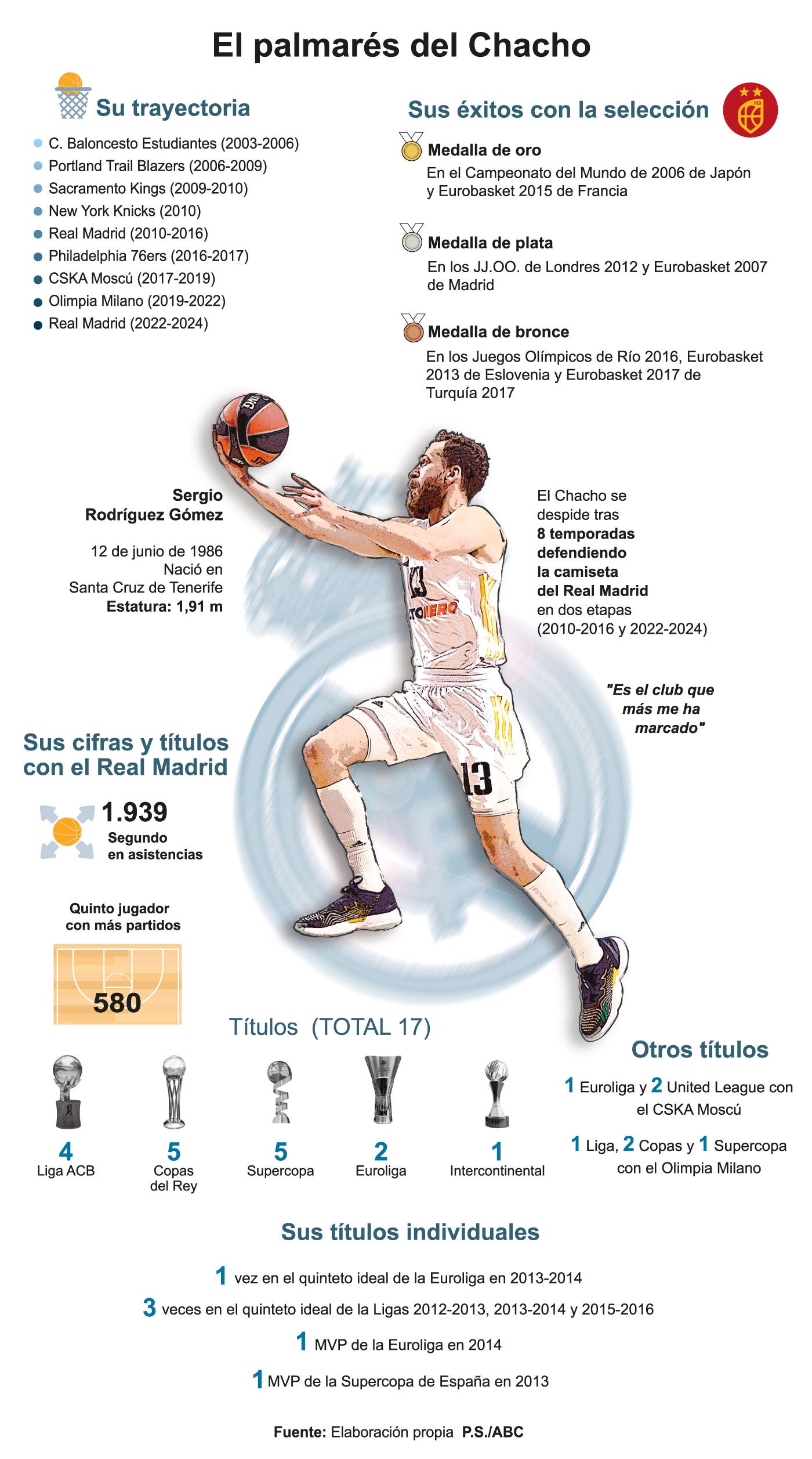 Iniciar sesión«Espero ser recordado como alguien que se divertía y lo daba todo para ganar». A Sergio Rodríguez le costó contener las lágrimas al pronunciar estas palabras. El legado que quiere que perdure de su trayectoria como jugador de baloncesto. El canario, 38 años, ... se ha despedido este miércoles de su deporte en un emotivo acto institucional en la Ciudad Real Madrid. El Chacho ha estado acompañado por su familia y por muchas de las personas que han sido importantes en su carrera. De todos ellos se ha acordado en su discurso, en el que ha repasado su excelente trayectoria antes de posar junto a los 17 títulos que conquistó con la camiseta del Real Madrid: 5 Supercopas, 5 Copas del Rey, 4 Ligas, 2 Euroligas y una Intercontinental.