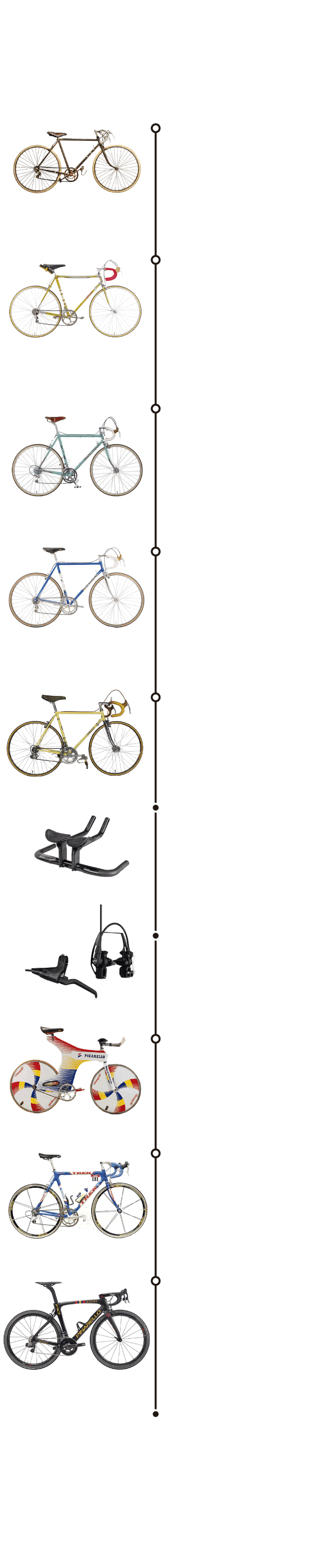 Una primera gran evolución fue la Bianchi con la que Fausto Coppi conquistó el Tour de 1949, verde turquesa como las que lucen hoy en las carreteras de medio mundo. La bici con la que ganó el Tour Jacques Anquetil pesaba 10 kilos, y la Colnago de Merckx, 9,6.